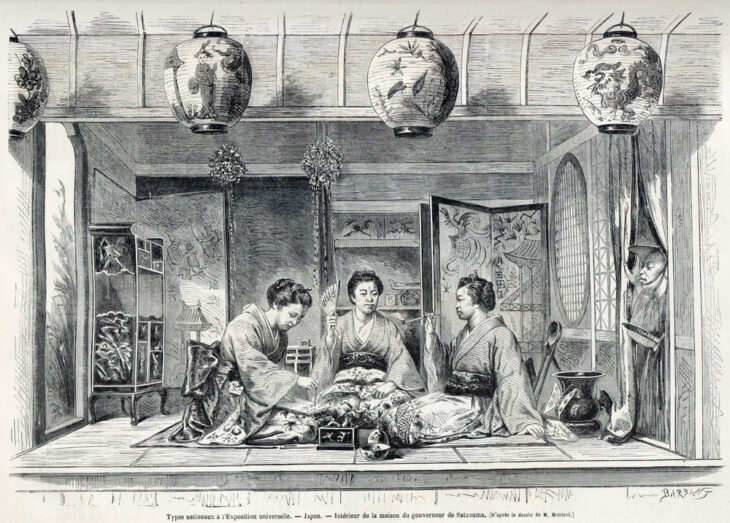 Later I will discuss why the exhibition was titled “Japonisme 2018” despite the contradiction. Recall similar International Exhibitions in the nineteenth century, which triggered the Japonisme trend in Europe and the United States. They were held five times in Paris in the second half of the nineteenth century: 1855, 1867, 1878, 1889 and 1900. Japan officially started to participate in 1867. The exhibits included a wide range of goods linked with Japanese lifestyle and culture, in addition to arts and crafts. Exhibitors from Japan showcased their country as well as its goods. They offered also Japanese acrobatic performances, entertainment by three geishas featuring tea service and demonstrations of daily life in a specially built teahouse (Fig. 2). At the 1878 Paris International Exposition, they even built a farmhouse in the Japanese garden of the Palais du Trocadéro (Palais de Chaillot). Participation in the International Exposition enhanced Japan’s reputation, which acquired more prestige, expanded the export industry through the attractive image of Japanese culture and increased interest.