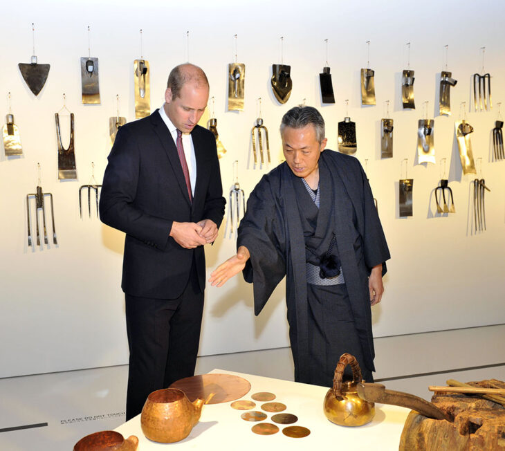 Prince William, Duke of Cambridge listens to an explanation by Tamagawa Motoyuki of Gyokusendo Co., Ltd. during the Japan House London exhibition, Biology of Metal: Metal Craftsmanship in Tsubame-Sanjo.