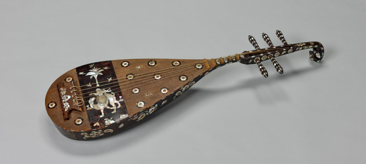 Five-stringed biwa lute of shitan with mother-of-pearl inlay