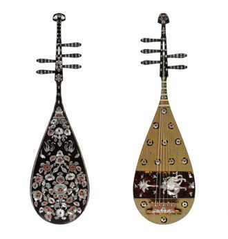 Front view (right) and back view (left) of the reproduction-imitation of Five-stringed biwa lute of shitan with mother-of-pearl inlay (as Red Sandalwood Five-String Biwa Lute with Mother-of-Pearl Decoration at the exhibition (By Sakamoto Kyokusai III, woodwork; Nitta Kiun, inlay; Kitamura Shosai and Matsuura Naoko, decoration; and Marusan Hashimoto Co., strings) 2011‒2018 (Heisei 23-30)