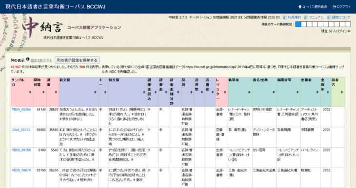 The Japanese corpora are publicly accessible linguistic databases that have collected large amounts of both written and spoken Japanese. The National Institute for Japanese Language and Linguistics (NINJAL) has taken the lead in developing the databases, including the Balanced Corpus of Contemporary Written Japanese (BCCWJ), the Historical Corpus of Japanese (CHJ), the Corpus of Japanese Dialects and the Corpus of Spoken Japanese. BCCWJ contains 104.3 million words drawn from a wide range of sources: books, magazines, newspapers, white papers, blogs, online forums, textbooks, legal texts and more. These are publicly accessible online. Besides the paid offline version, there are two free applications: Shonagon (no registration required) and Chunagon (registration required). Shonagon allows users to search BCCWJ, while Chunagon provides access to all corpora. The image above shows a sample search result for the word ‘te (hand)’ in BCCWJ using Chunagon.