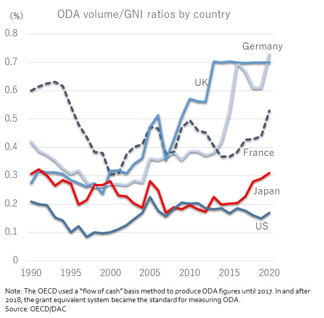 In the Group of Seven, the United Kingdom has the statutory ODA volume target of 0.7% of GNI, while France’s ODA volume rose from 0.44% in 2019 to 0.53% in 2020 and Germany sharply increased from 0.61% in 2019 to 0.73% in 2020. The ODA/GNI ratio for the United States is traditionally low, but it remains the largest donor of ODA. Moreover, the U.S. government has enhanced federal aid agencies’ functions. For example, it now appoints a ministerial-level administrator as the head of the U.S. Agency for International Development (USAID) — which is the U.S. counterpart of JICA.