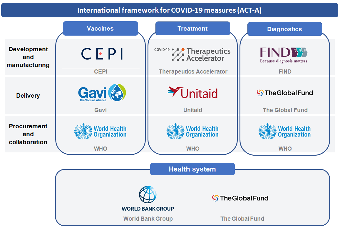 It is a framework that organizes international support for the COVID-19 response into the three pillars of Vaccines, Treatment, and Diagnostics, and shares the work among the international organizations and bodies that have the most expertise at each stage (see figure). For example, the Coalition for Epidemic Preparedness Innovations CEPI (a global partnership between public, private, philanthropic, and civil society organizations) is responsible for the development and manufacturing of vaccines, Gavi handles delivery, while WHO is responsible for procurement and collaboration. I think this initiative shows one possible direction for the global health framework, one that includes collaboration between civil society and private sector, which is already common practice in global health.