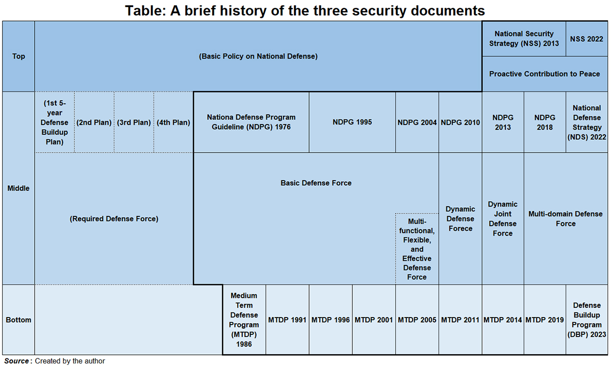 To begin with, the three documents were not initially compiled as a “three-piece set.” Aside from the “Basic Policy on National Defense” (1957–2013), which had become a dead letter policy, there was originally only the NDPG as the “one document,” which was first developed in 1976 during the Miki Takeo administration period. Nine years later, during the Nakasone Yasuhiro administration period, the MTDP was created under the NDPG in 1985. Twenty-eight years later, in 2013, the NSS was formulated, thus finally marking the appearance of the three documents.