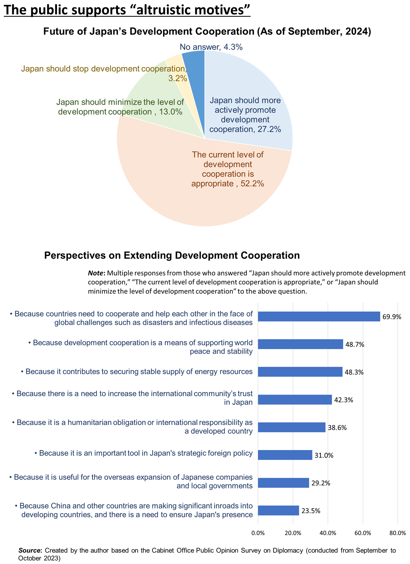 In the 21st century, the size of Japan’s ODA budget shrank, and former recipient countries, including China, gradually became donor countries. It was also during this period that the Japanese government began to put “national interests” first. In this context, the results of domestic opinion polls show an interesting trend. The reason why people support ODA is that they emphasize the altruistic aspects of aid, not because aid serves the national interests. For example, in the results of the most recent survey conducted in September 2023, the percentage of people who cited “mutual assistance among countries” and “world peace and stability” as reasons why development cooperation is necessary exceeded responses such as “important for Japan’s diplomacy” and “overseas expansion of Japanese companies” (see chart).