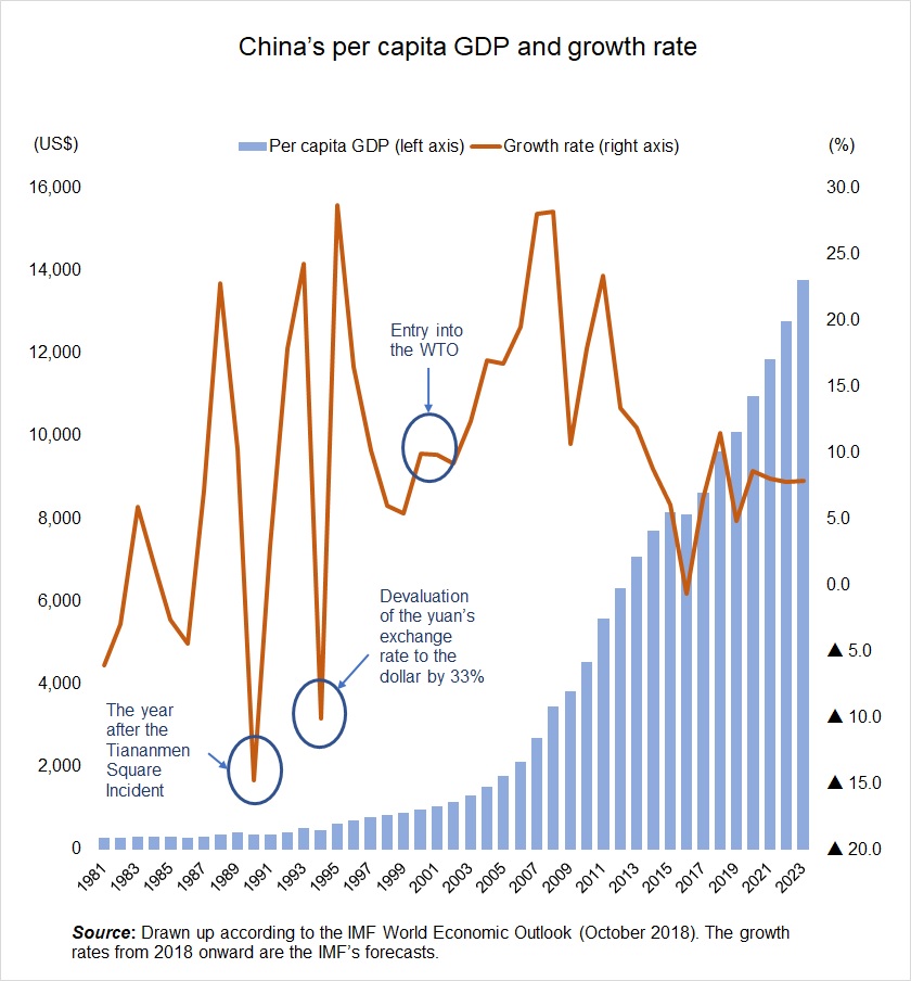According to the International Monetary Fund (IMF), China’s per capita GDP was 8,643 dollars in 2017, already entering the level of the middle-income trap. This growth rate exceeded 10% every year from 2003 to 2013, but it has tended to decrease in recent years (see chart). China is now standing at the crossroads between avoiding the middle-income trap and growing to be an advanced country, and becoming stuck in the middle-income trap and remaining a developing country.
