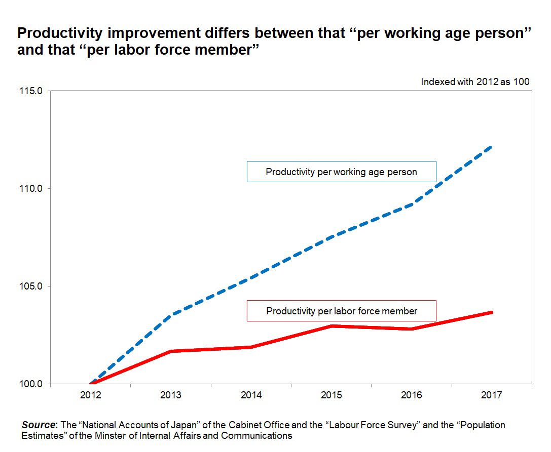 Such a mobilization type of response is not sustainable because it will reach its limit at some time in the future. In addition, the working force that has newly entered into the labor force was centered on non-regular workers with low wages and productivity. This is one of the major reasons why the average wage does not rise much and the average labor productivity does not improve despite the tightening employment situation. The government should rethink its growth strategy by setting an increase in productivity per worker as the major target.