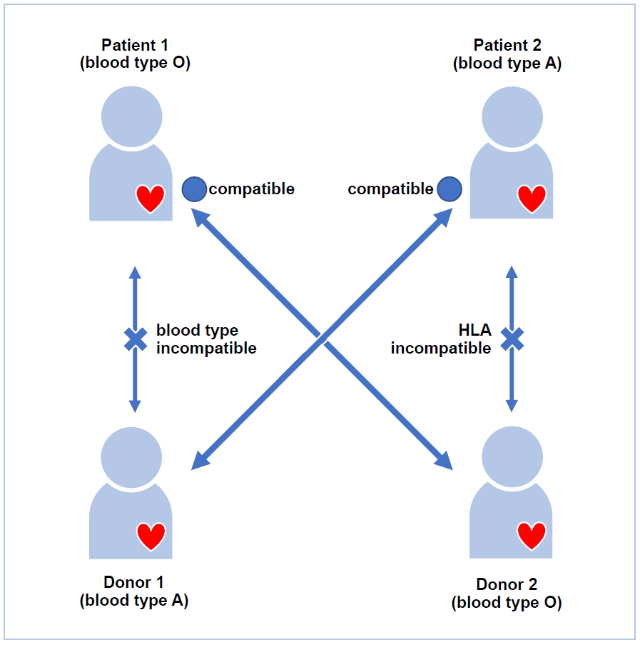 The design of systems for matching kidney donors with patients is an example of a successful social implementation for market design researchers. The fundamental idea is that when the blood groups of a donor and patient are incompatible, incompatible pairs can be matched. For example, one pair including a patient with a blood type of O and a donor with a blood type of A can be matched with another pair consisting of a patient with a blood type of A and a donor with a blood type of O. If the donor and patient are incompatible because of a reason other than blood type (for example, Human Leukocyte Antigen [HLA] antibodies), it may be possible to swap the donors between the two pairs to make both kidneys compatible with the patients in need (see figure). This is similar to goods (kidneys) being exchanged on a marketplace.