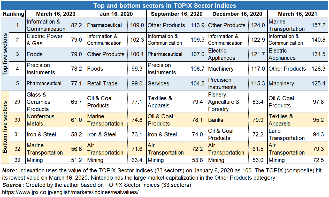 Another special characteristic is that the impact of the limits on economic activities due to the COVID-19 pandemic has varied greatly from sector to sector, which is also reflected in the stock price trends. Companies that provide goods and services necessary for stay-at-home consumption have performed better and their stock prices have also risen in anticipation. Meanwhile, restaurants, retail shops, and aviation businesses, which were hit by restrictions on their activities, are still sluggish performers.