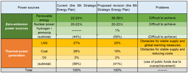It was not until July 21 2021 that the responsible agency, the Ministry of Economy, Trade and Industry (METI), was able to propose a rough draft of predicted composition of power sources in FY2030 that was adjusted to harmonize with the 46% reduction target (see Table 1), doing so in the Strategic Policy Committee of the Advisory Committee for Natural Resources and Energy (hereinafter, “the Strategic Policy Committee”) that was responsible for formulating the next (6th) Strategic Energy Plan. After that, the Strategic Policy Committee approved that draft with a majority at a meeting on August 4, 2021.