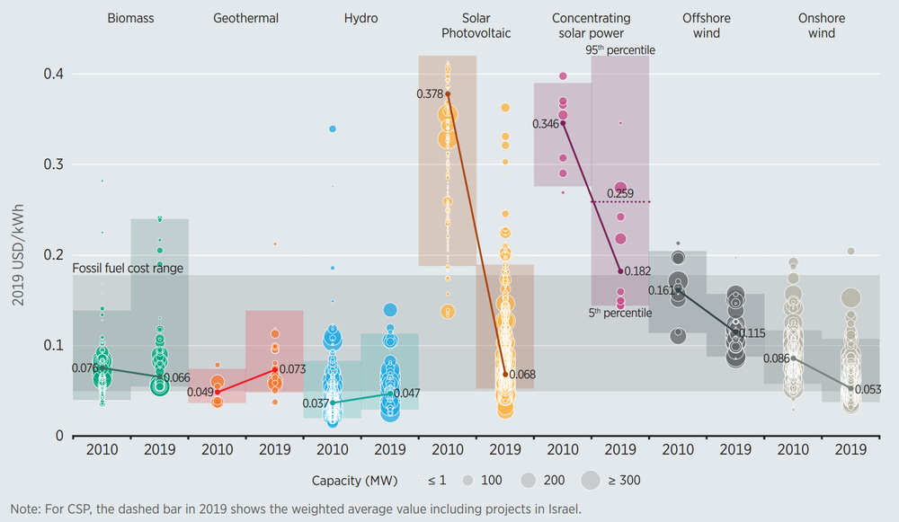 Note: This data is for the year of commissioning. The diameter of the circle represents the size of the project, with its centre the value for the cost of each project on the Y axis. The thick lines are the global weighted-average LCOE value for plants commissioned in each year. Real weighted average cost of capital (WACC) is 7.5% for OECD countries and China and 10% for the rest of the world. The single band represents the fossil fuel-fired power generation cost range, while the bands for each technology and year represent the 5th and 95th percentile bands for renewable projects. Source: IRENA Renewable Cost Database/Renewable Power Generation Costs in 2019