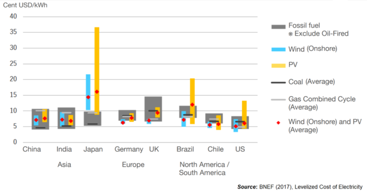 Why did this occur? As mentioned before, if access to nuclear power was difficult, then thermal power generation would become a realistic option. But for developing countries, thermal power required a large investment making its introduction difficult. Power generation with renewable energy, such as solar and wind power, however, did not require as large an investment as thermal power. It also allowed for the supply of energy on its own without the need for the procurement of fossil fuels. Energy could be procured from deserts with previously little use value simply by installing solar panels or wind power generators. The increase in the amount of energy introduced leads to the creation of demand, and the cost is lowered through economies of scale. This cycle of positive growth quickly developed in the 2010s. The cost of solar power generation in 2019 in particular dropped to 1/5 the cost compared to 2010, dropping to 7 cents per kWh (Fig. 1). Even when looking at the action of various countries, analysis shows that 2016 to 2017 was the turning point since the adoption of the Paris Agreement, with the cost per kWh for solar and wind power at less than 10 cents in major countries in the first half of 2017, and we can see that this has a cost-competitiveness with gas-fired power generation and coal fired power generation (Fig. 2). Renewable energy with its increased cost performance has truly become a game changer.