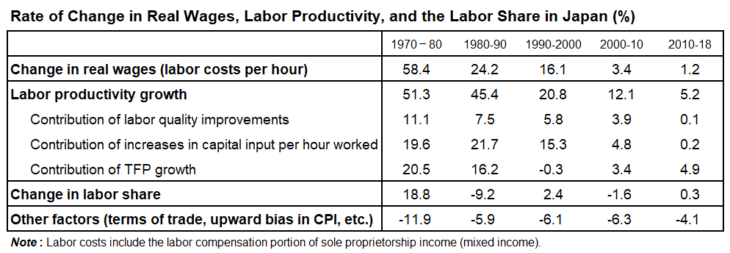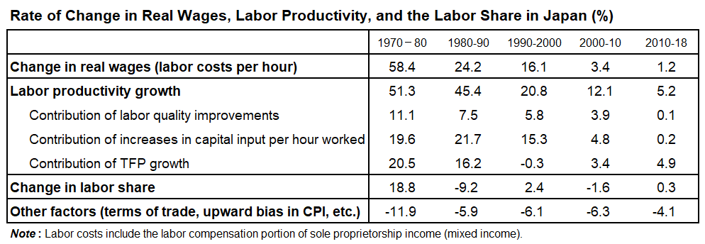 Looking at the period since 1980, in each of the decades “other factors” have lowered real wages by around 5–6%. Since labor productivity growth has fallen over the decades and the labor share has become comparatively stable, the relative importance of these “other factors” has increased. Therefore, when considering measures related to real wages, it is also essential to re-examine and improve CPI statistics and analyze the determinants of the terms of trade.
