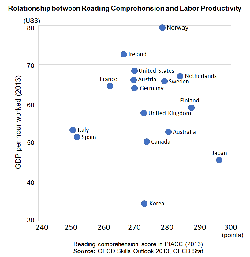 According to the International Survey of Adult Competencies (PIAAC) conducted by the Organization for Economic Cooperation and Development (OECD), the average reading and numeracy scores of people living in Japan are very high. On the other hand, labor productivity in Japan is low. When a graph is created with reading comprehension on the horizontal axis and labor productivity on the vertical axis, a rough trend can be seen: the higher the reading comprehension, the higher the labor productivity (see figure). However, despite Japan’s high reading comprehension, labor productivity remains low.