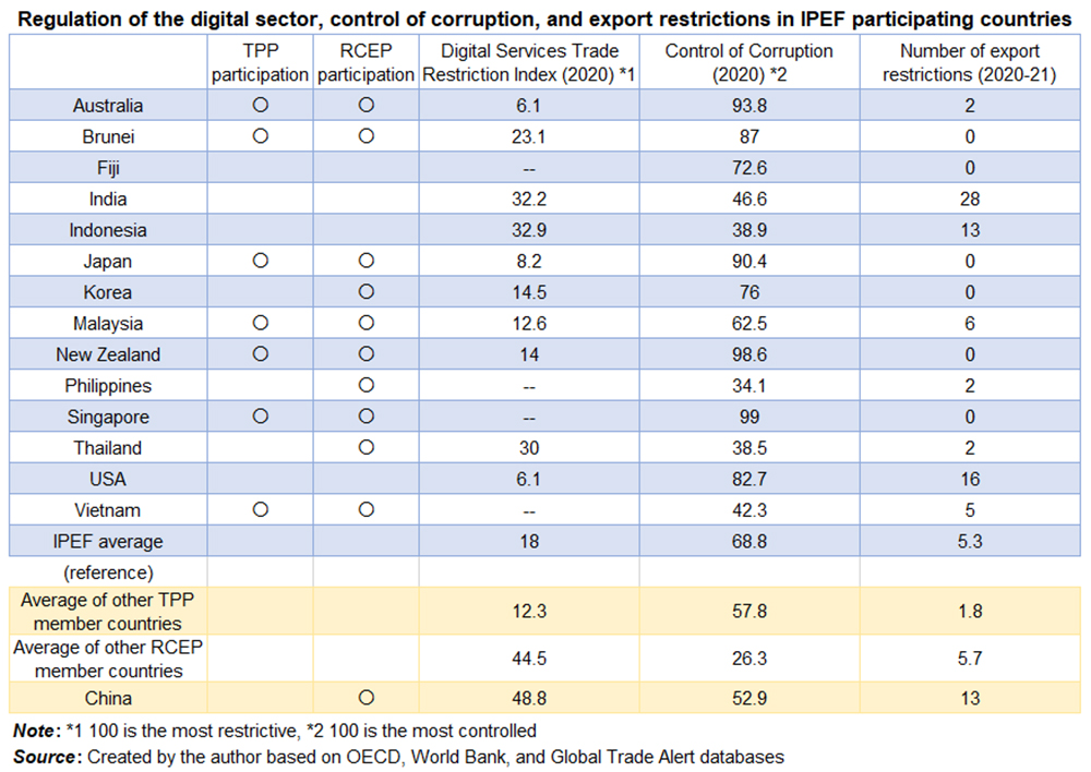 TPP member countries that have not agreed to join the IPEF have less digital regulation than participating countries (see Table), and there is not much of a difference between members and non-members in terms of control of corruption. Accordingly, it indicates that outcomes under the IPEF in these areas could also be applied to other TPP member countries comparatively easily