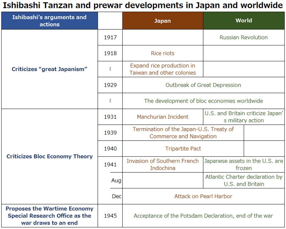 Ideologically close to Ishibashi, the economist Takahashi Kamekichi (1891–1977) came to criticize Britain, which had always argued for free trade, for switching to a bloc economy, and cooperated with the military authorities by arguing for the creation of the Japan-Manchukuo-China economic bloc. Even though Ishibashi accepted the hard facts behind Japan’s actions, he maintained his basic ideas and continued to argue for improving relations with Britain and to stress the importance of international trade while criticizing bloc economic theory, but he was unable to change the course of events.