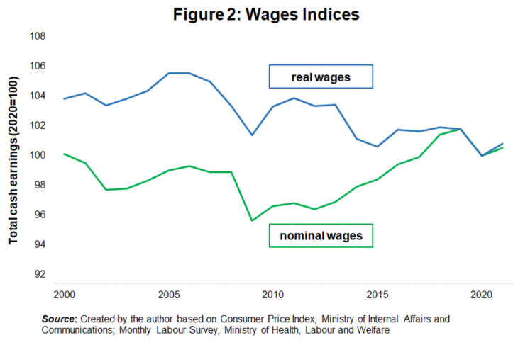 It was said that the sluggish wage increases were due to the increase in the number of workers with short working hours (since shorter working hours reduce wages, the average wages tend to fall as the number of workers with shorter working hours increases). Even if we only consider only full-time “regular workers,” real wages have remained almost unchanged after falling sharply in 2014 (falling further in 2020 due to the COVID-19 pandemic) (Fig. 2). From 2013 to 2019, nominal wages continued to rise but real wages developed like this because there was no strong rise in nominal wages to exceed the rising prices.