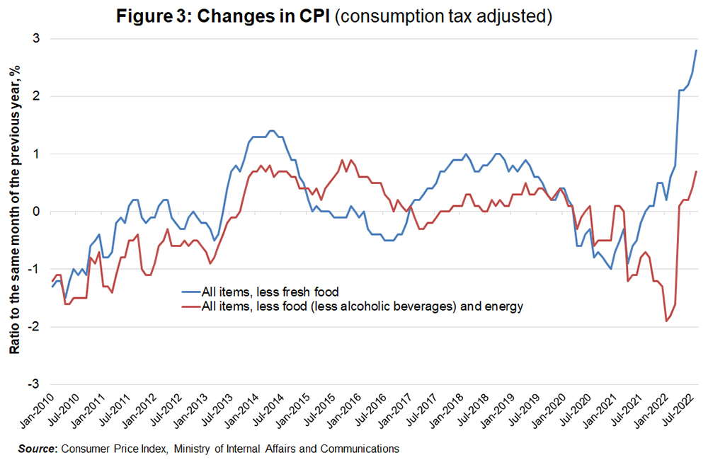 Due to the impact of the rise in import prices because of the weak yen and the consumption tax hike, the increase rate of the Consumer Price Index (CPI) (year-on-year) including consumption tax from April to September 2014 exceeded 3%. However, these “high prices” were only temporary. Before the consumption tax hike, there were those who optimistically believed that the deflation could be overcome through rising prices in general from the increase in the consumption tax rate, but in reality, the rising prices caused a buying spree, and sluggish sales led to companies reassessing bullish pricing and slowed down the pace of rising prices.