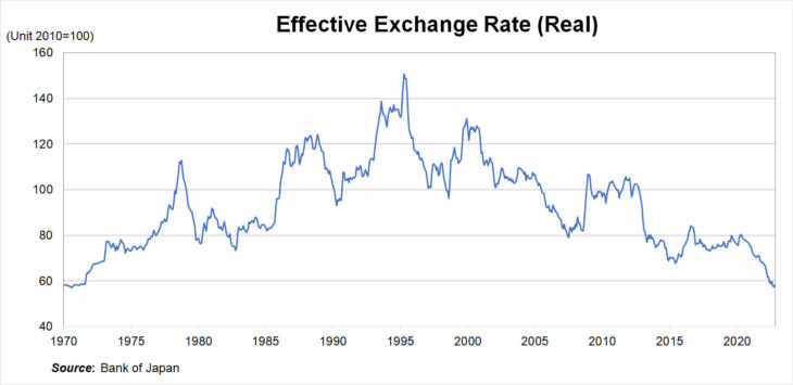 As everyone knows, the yen fell dramatically from the beginning of 2022, weakening from 110 against the dollar at the beginning of the year to past 150 against the dollar for a time in October. Such a dramatic weakening of the yen is, of course, largely attributable to the fact that the FRB raised interest rates at a far faster pace than the markets anticipated but at the same time the YCC policy framework is likely to have amplified the weakness of the yen against the dollar. This is not something which occurred to the yen-dollar exchange rate only. Furthermore, in a situation where inflation in Japan was much lower than in other advanced economies and so from the viewpoint of purchasing power parity (PPP), appreciation of the yen would have come as no surprise, depreciation of the yen continued. Analysis of the real effective exchange rate, which also takes other exchange rates into consideration and reflects the difference between inflation rates (see Fig.), shows that the yen is currently at its lowest level in 50 years, a level not seen since 1973 when Japan adopted the floating exchange rate system.