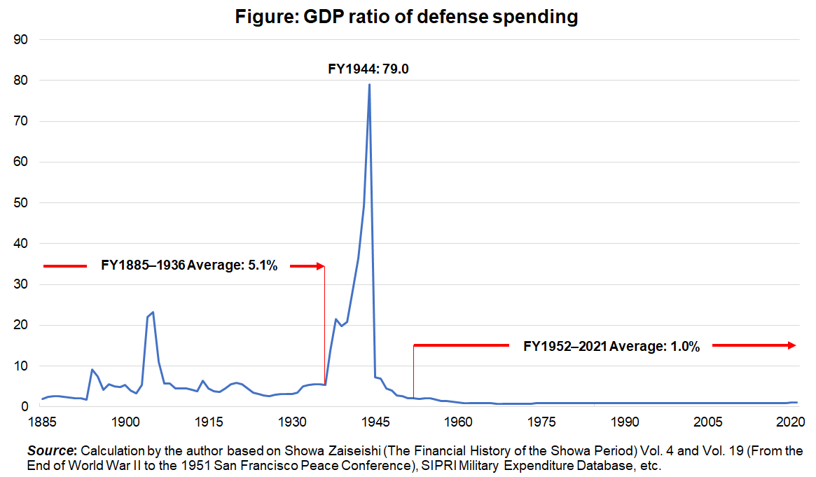 The figure shows the long-term trend of Japan’s defense spending as a percentage of GDP. Prewar defense spending averaged around 5% of GDP (FY1885–1936). It rose to double digits from the Sino-Japanese War to the Pacific War, and in 1944 it is believed to have accounted for nearly 80% of GDP.