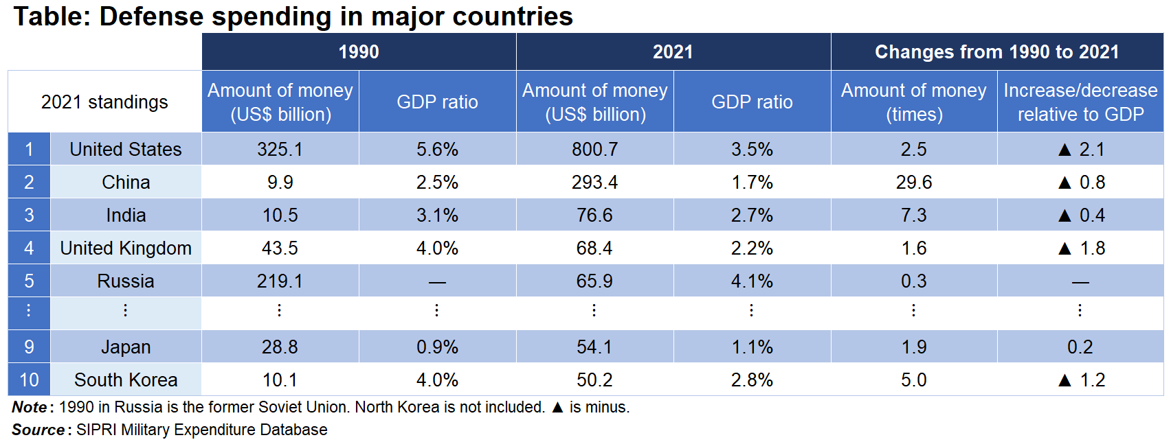 Since the 1990s, the geopolitical situation in Asia has changed significantly (see Table). Looking at the change in defense spending from 1990 to 2021, the United States remains dominant, but China has grown about 30 times in dollar terms while the United States has grown 2.5 times. Although the numbers should be viewed with some leeway, China has moved up to second place, replacing the former Soviet Union. India, which also increased seven times, follows in third place. South Korea ranked 10th after Japan with a fivefold increase.