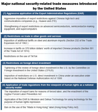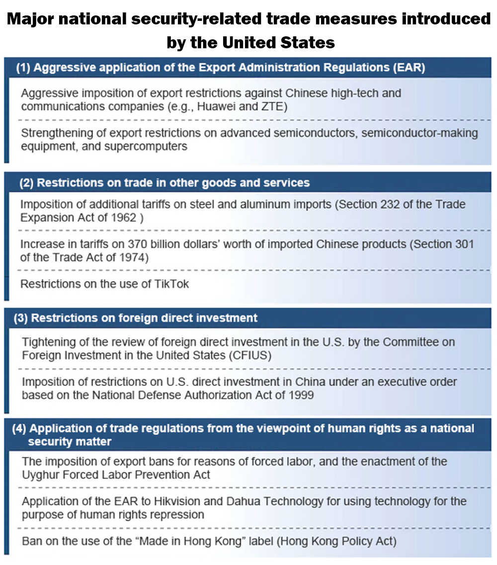 The fragmentation of the international trade and investment system is proceeding in the name of national security. In particular, since the years of the Trump administration, the United States has implemented many trade measures for national security reasons. Specific examples include: (1) aggressive application of the Export Administration Regulations (EAR); (2) the imposition of other restrictions on trade in goods and services; (3) the imposition of restrictions on foreign direct investment; and (4) the application of trade regulations from the viewpoint of human rights as a national security matter (see table).