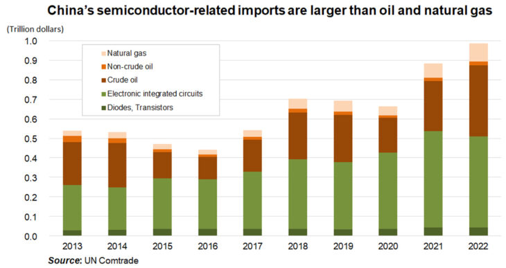 Chinese imports of semiconductor-related products exceed those of natural gas and oil, whose production within China is limited (see figure). China is firmly embedded in global relations in the economic sphere, which is a “substructure.”