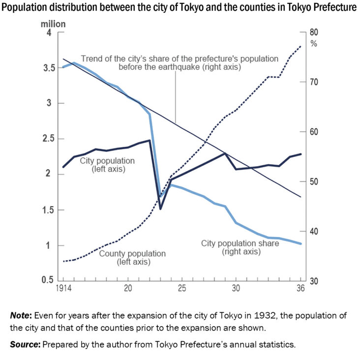 The population in the city of Tokyo plummeted from 2.48 million at the end of 1922 to 1.51 million at the end of 1923, with the city’s share of Tokyo Prefecture’s population plunging to 47.0%. In fact, before the earthquake, the population share for the city had been on a downward trend due to overpopulation. After the earthquake, however, the downward trend accelerated, and the previous trend of increase ended. The earthquake prompted people to rapidly and irreversibly move from Tokyo to suburban counties.