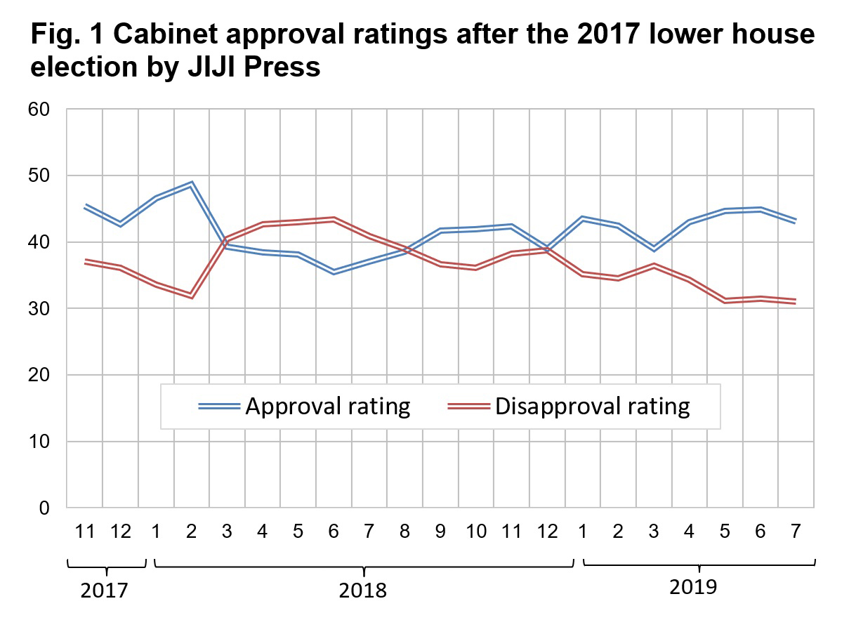 It can be said that the political situation developed stably for the LDP-Komeito coalition administration for one year until the last upper house election. The Kake Gakuen and Moritomo Gakuen scandals that erupted in 2017 persisted until around the summer of 2018, and fierce criticisms by the media and opposition parties led to the lowering of Cabinet approval ratings (see Figure 1 below). Probably because the general public became sick of the scandals in around fall, however, Cabinet approval ratings began to rise again. On the whole, Cabinet approval ratings subsequently fluctuated stably. In particular, probably because of the festive mood at the beginning of the new era, Cabinet disapproval ratings began to decline noticeably in May 2019 according to a survey by JIJI Press. In early 2019, the media gave major coverage to the Ministry of Health, Labour and Welfare’s inappropriate monthly labor statistics scandal. In June, the Financial Services Agency’s report on post-retirement financing was essentially retracted after it was released. But Cabinet approval rating data indicate that these scandals did not have a major impact on the attitude of the electorate.