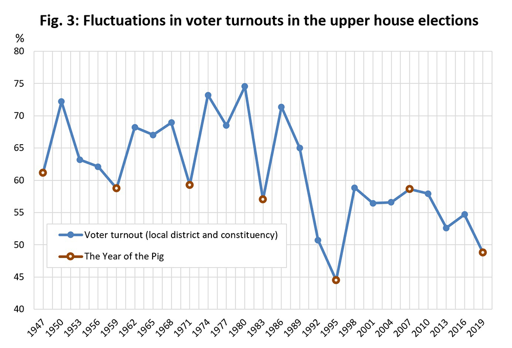 The last upper house election that took place in this stable political situation lacked the expected enthusiasm, and the voter turnout was just 48.8% in the constituencies (Fig. 3). From the beginning, it has been thought that the voter turnout tends to be lower in the upper house election in the Year of the Pig when nationwide local elections are held in spring, because local politicians are inactive in terms of gathering votes. The voter turnout dropped about 6% in the last election as well, compared with the upper house election three years ago. After the inauguration of the 2nd Abe administration, however, the voter turnout was in the first half of 50% in both the upper house elections three and six years ago. It is appropriate to think that lower voter turnouts are often seen in upper house elections, regardless of whether or not nationwide local elections are held.