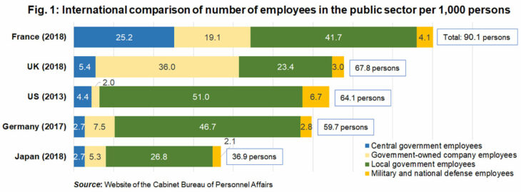The number of Japanese civil servants (national and local) per 1,000 persons is even lower than that of the United Kingdom and the United States, both known for their preference for “small government” (Figure 1). This number includes those who are not public servants in the narrow sense, such as employees of independent administrative agencies, national university corporations, and special corporations.