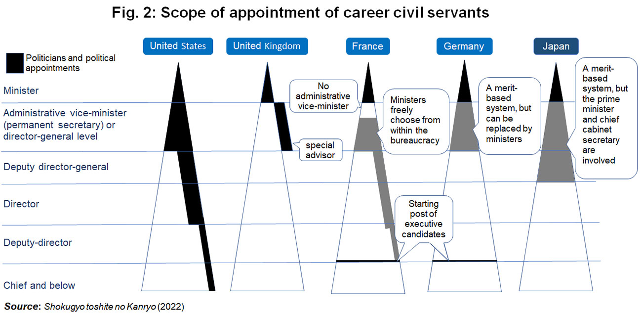 In Germany and France, unlike the United Kingdom, there is considerable leeway for ministers to have their intentions reflected in executive posts at director-general level and above. However, they are basically selected from among qualified groups of high-ranking bureaucrats, which makes the situation different from the United States.