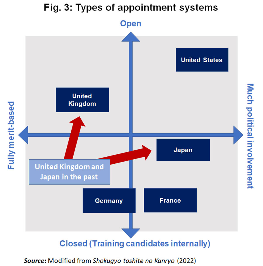 The characteristics of each country’s appointment system can be indicated by two axes: “whether there is wide political involvement or it is merit-based” and “whether it is open or closed (candidates are trained internally)” (Figure 3).