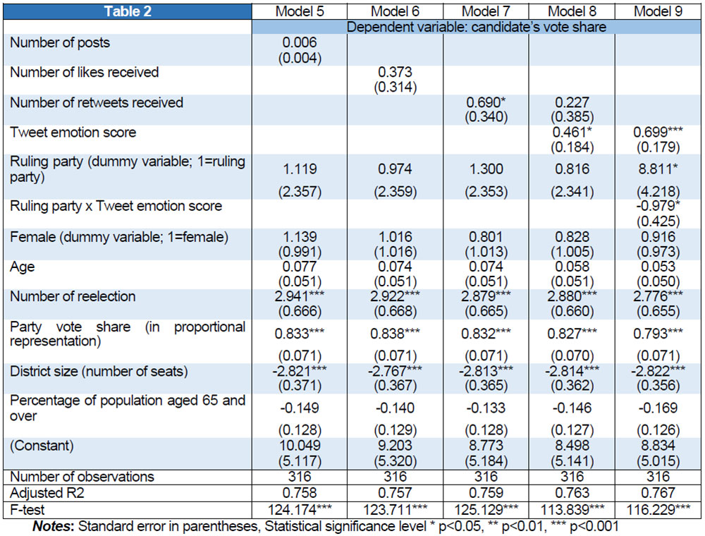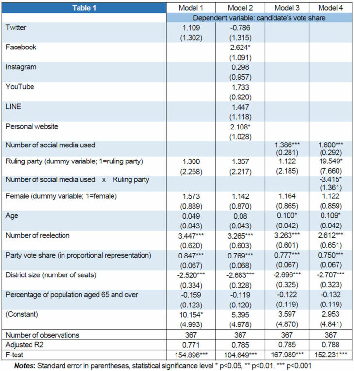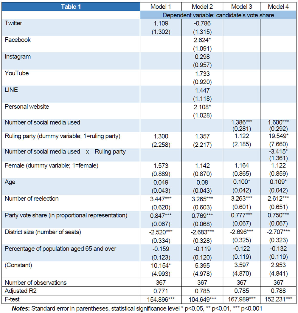 Table 1 shows the results of applying a standard statistical method called (multiple) regression analysis to estimate the effect of using each type of social media on the vote share, as well as to detect any tendency that the more social media (out of the abovementioned six types) candidates use, the more votes they get.