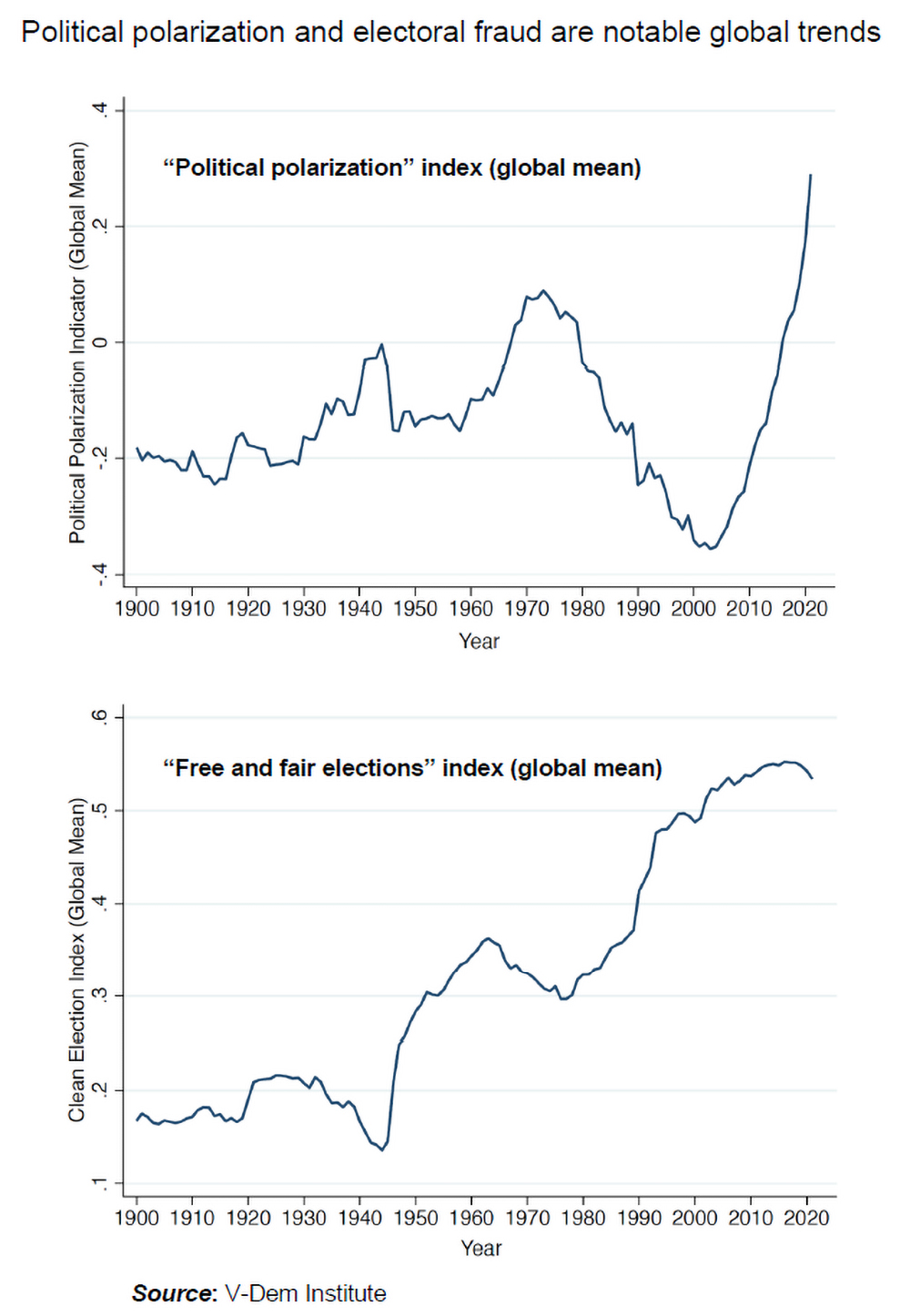 The second reason is widespread electoral fraud, including repression, harassment, and vote tampering. The V-Dem Institute’s “free and fair elections” index was stagnant since the mid-1980s but has deteriorated in recent years (see bottom figure).