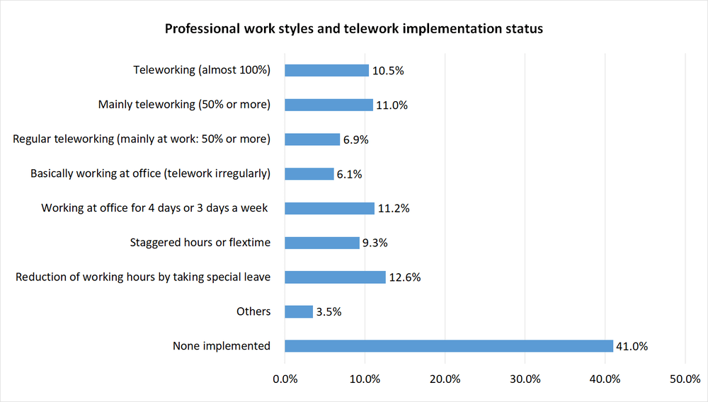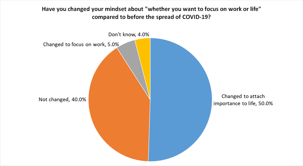 You can also see changes in awareness for these types of workers in the online survey. When asked whether they wanted to put more emphasis on their work or personal life, 50% of respondents answered, “personal life,” with 55.9% of men raising children responding that their awareness had changed in relation to dealing with housework and child raising, as time spent at home has increased for both children and parents due to COVID-19. Of the 34.5% of people who had experienced teleworking due to COVID-19, 64.2% responded that their awareness evolved towards an emphasis on their personal lives. Additionally, 24.6% said they had greater interest in moving to rural areas, with 46.3% responding that they desired a change of vocation or a side job. Off-peak commuting and telework, which had not advanced despite the government working to promote it, took off due to COVID-19, and awareness has clearly evolved. For example, we can perhaps see the potential for change in the long-standing issues in Japan of a heavy concentration of people in Tokyo and depopulation in rural areas, as well as a stagnant labor market.