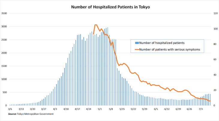 At a press conference on the previous day, July 1, Tokyo Governor Koike Yuriko presented current knowledge while also making ample references to the condition of medical care, saying, “We were not able to trace paths of infections in March, but we are now tracing cases linked to post-infection. Sixty-seven is a large number, but the background behind these infections is different. The most important aspect is the state of hospitals. We have secured 1,000 beds. There are plenty of hotels to be used for stay-in recuperation. There are 280 people hospitalized, but only 10 are seriously ill. Most have a mild case.” 3,000 to 4,000 beds will be secured in stages, responding to the state of increasing infections. At its peak up until this point, 2,974 people were hospitalized. Tokyo has already requested medical institutions to secure 3,000 beds.