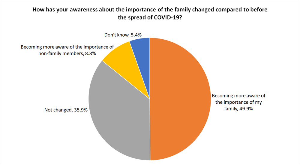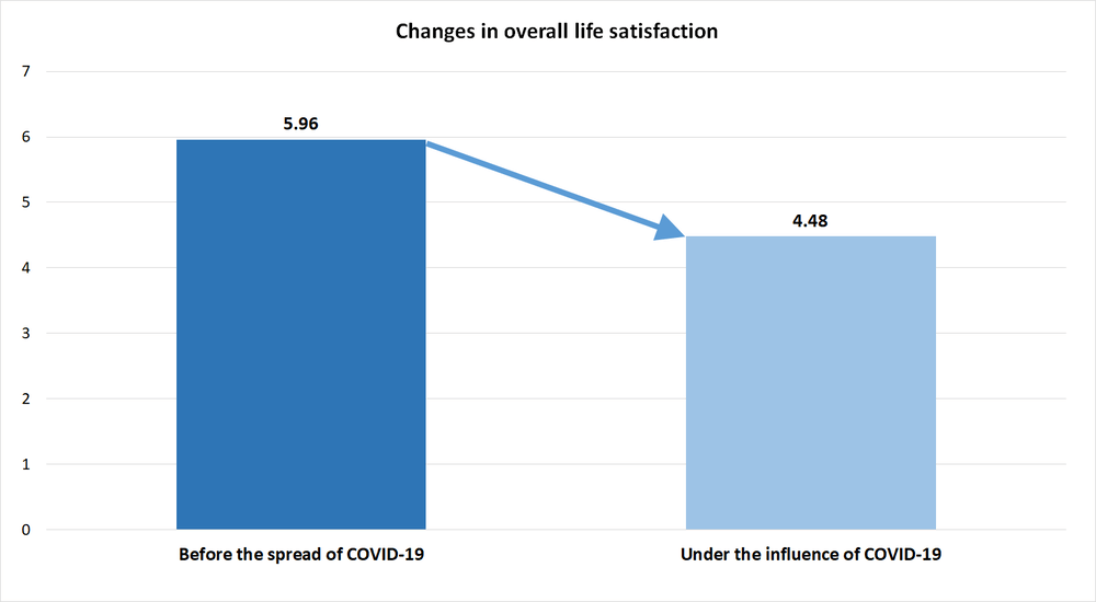 On a 10-point scale evaluating lifestyle satisfaction before and after the spread of COVID-19, the average number dropped from 5.96 before COVID-19 to 4.48. When we look deeper, the number for housewives with elementary school-aged children significantly dropped from 6.61 to 4.26, and the number for women, 60 and older, dropped from 6.51 to 4.42. Enjoyment and interest in life dropped from 6.33 to 4.38, and connection with society dropped from 6.07 to 4.32. All of these show anxiety and discontent through the burden of housework, requests for people to voluntarily refrain from going out, limited shopping, and restrictions even on having enjoyable conversations with friends.
