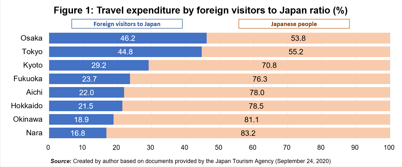 It’s a situation of “lost inbound” in which inbound tourism since last April continues to be down more than 99% month-on-month vs. the previous year. Bearing in mind that the amount spent by inbound travelers in 2019 was 4.8 trillion yen, that has mostly gone and the economic loss is extremely large. In particular, areas with a high ratio of expenditure by inbound tourists, such as Osaka (46.2%) and Tokyo at (44.8%) have been very greatly affected compared to other regions (see figure 1).