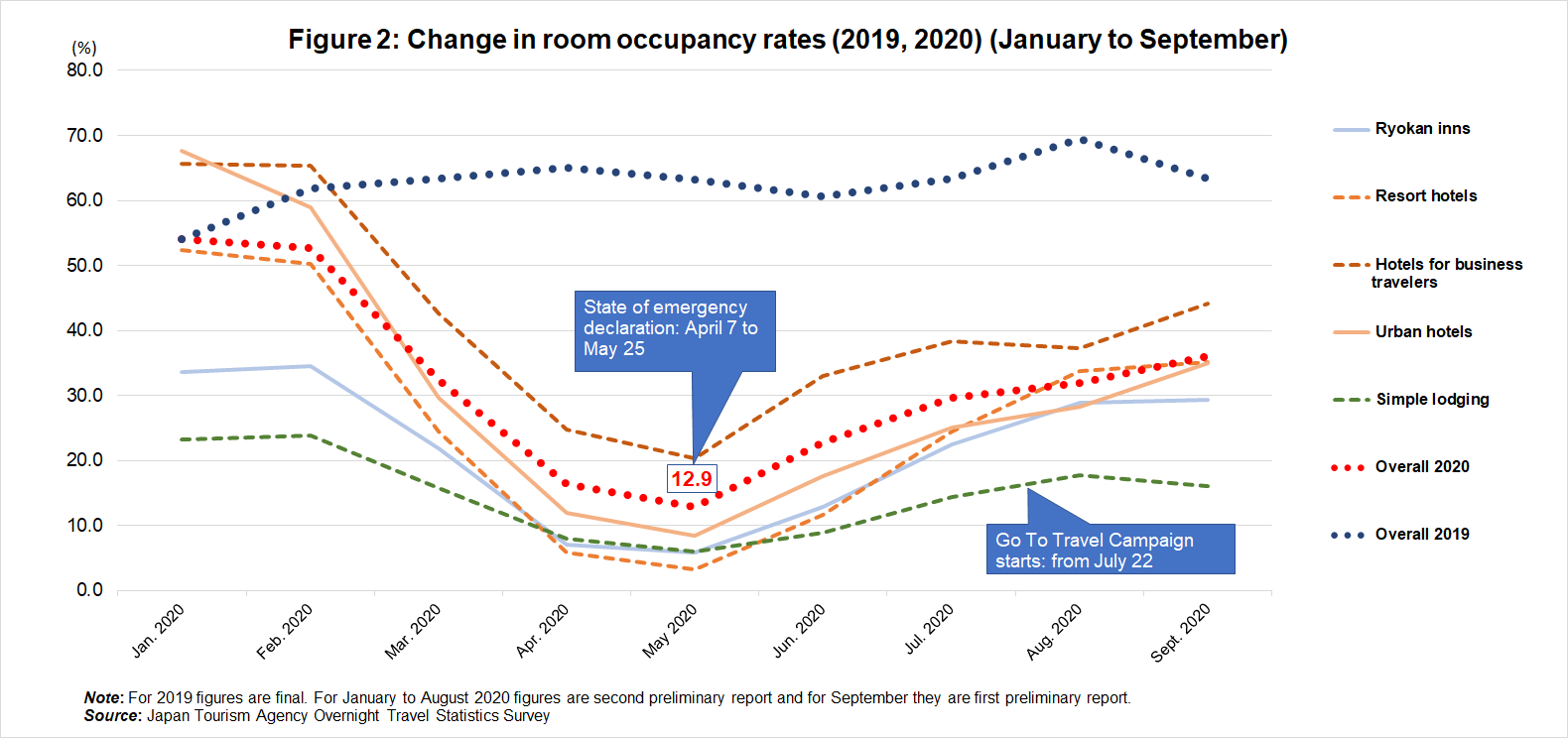 Alongside this lost inbound, domestic tourism demand has also shrunk. Since March accommodation occupancy rates have greatly fallen, dropping to just 12.9% in May (see figure 2). There have been fifty-six bankruptcies in the accommodation sector since February (liabilities of over 10 million yen) (as of 4 pm, 19 November, 2020, according to Tokyo Shoko Research, Ltd.)