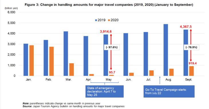 Amid the COVID-19 pandemic, the Go To campaign was truly a “blessing in a time of need” for tourism-related companies that had suffered severe damage. According to Go To user figures released by the Japan Tourism Agency on 13 November 2020, as of 15 October there had been approximately 31.38 million overnight stays and subsidies had reached approximately 139.7 billion yen. As a result, hotel room occupancy rates recovered to 31.9% in August and 35.6% in September (see figure 2). Travel agents handling amounts also recovered to 86.3% lower than the same month in the previous year for August and 78.9% for September (see figure 3).