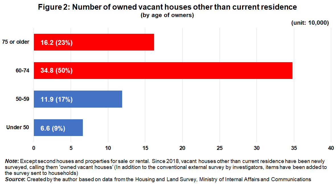 According to the survey of vacant houses owned by households, other than current residences, the Housing and Land Survey (2018), Ministry of Internal Affairs and Communications, 73% of vacant houses that have been inherited or gifted (excluding second homes, or homes for sale or rent) have been left in a state of neglect for more than five years. Additionally, owners of vacant houses other than current residences are growing increasingly old with 50% in the 60–74 age bracket, and 23% 75 or older. (Fig. 2)