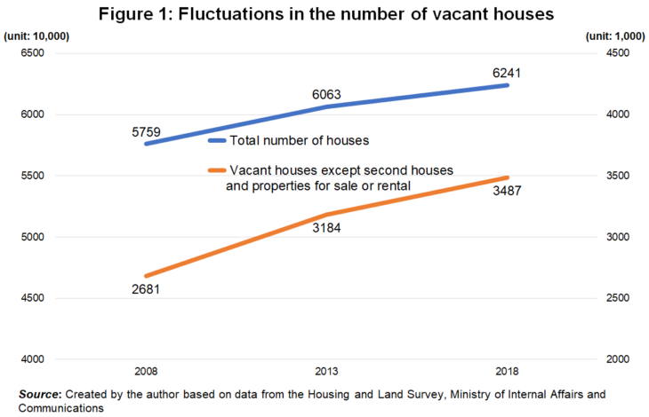 Between 2008 and 2018, the total number of houses increased from 57.59 million to 62.41 million, which is an annual average increase of approximately 480,000 houses. Meanwhile, the number of vacant houses, except houses for sale, for rent, or second homes, rose from 2.68 million to 3.49 million in the same period, posting an annual increase of approximately 80,000. (Fig. 1)