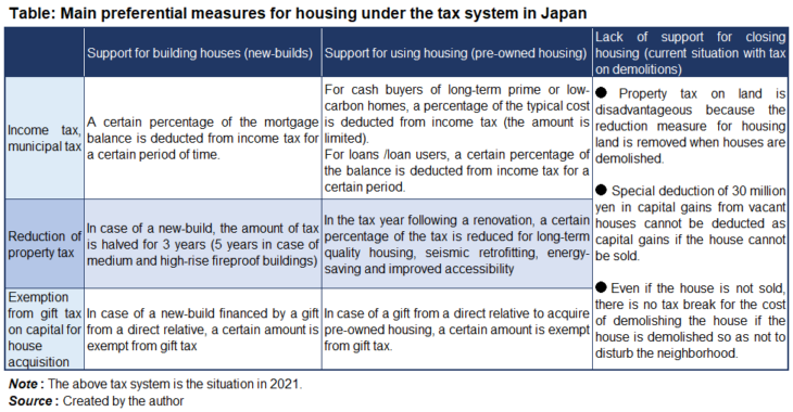 In the past, national housing policies have emphasized measures to support building and using housing, such as municipal property tax relief measures to encourage circulation of new-builds and pre-owned housing, or tax deduction on housing loans. However, unfortunately, there have been literally no measures to support the closing of houses. As a vacant house measure, the state has introduced a special tax deduction of 30 million yen, which applies to capital gains tax on the sale of vacant houses, but the demolition cost can only be subtracted as transfer cost if the vacant house has been sold. At the stage where the vacant house cannot be sold, the cost of demolition is a housekeeping expense in taxation terms, and there are no tax reduction measures. Therefore, some aspects of the tax system make it disadvantageous to close a house. Accordingly, we have now arrived at a stage where we must consider a taxation system that promotes the demolition of vacant houses so that owners (including future heirs), who raise the funds to demolish a house within a certain period after the inheritance, are eligible for tax breaks on the cost of demolition, or inheritance tax breaks on condition of circulating the property through demolition or sales.