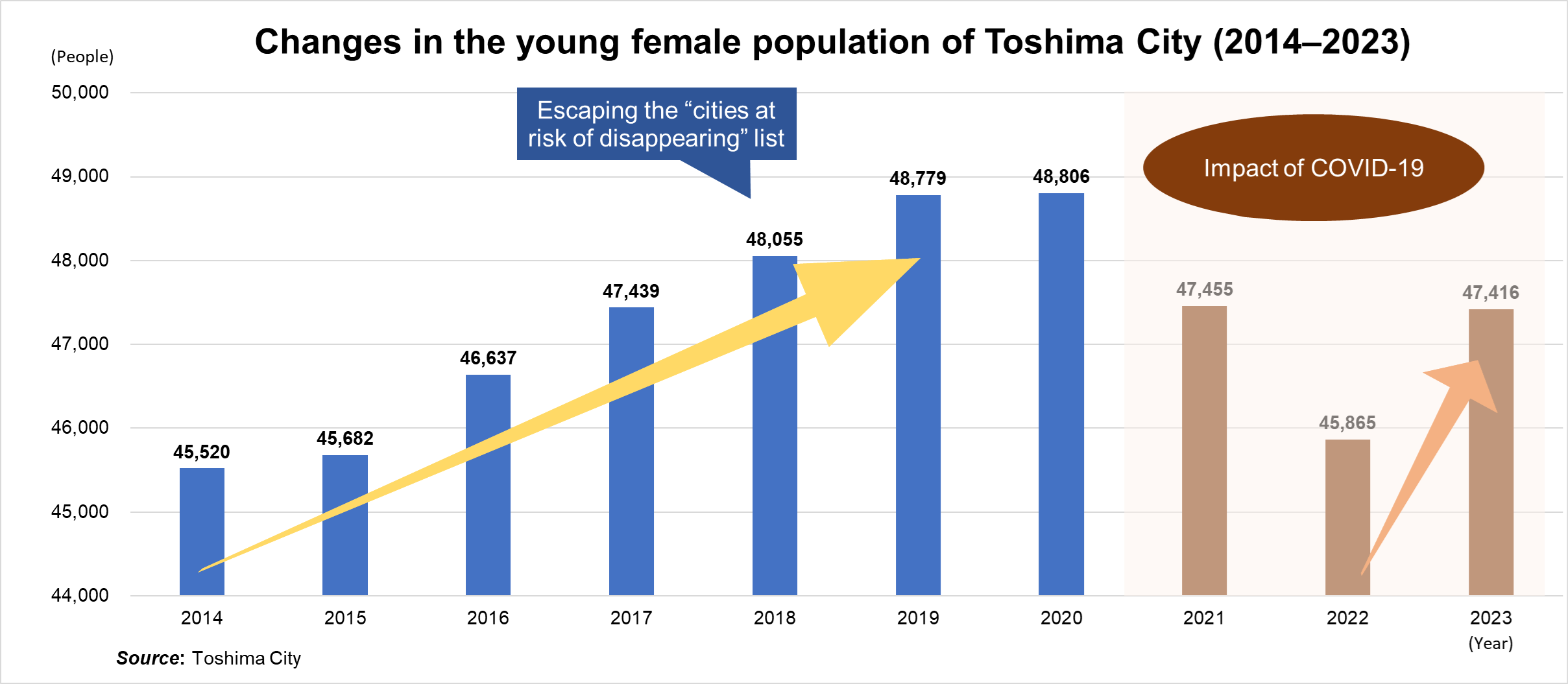 Since then, Toshima City has taken various measures to increase its young female population by more than 2,500 people, from 45,520 to 48,055 between 2014 and 2018 (see figure). The 2018 population projections from the National Institute of Population and Social Security Research (IPSS) showed that the decline in Toshima City’s young female population between 2015 and 2045 was 18.9%, a significant improvement. If we were able to recover in this way, I felt that we needed to think beyond that, rather than stop there.