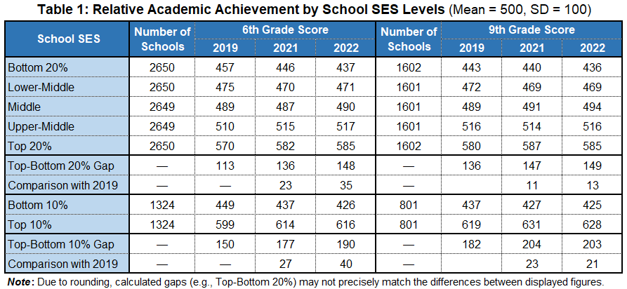 Table 1 illustrates how SES-based disparities in academic achievement between schools, already evident before the pandemic, expanded for both elementary and junior high schools from 2019 to 2021. When comparing the top and bottom 10% SES groups, the score gap widened by 27 points among sixth graders and 23 points among ninth graders. From 2021 to 2022, the gap continued to grow for sixth graders but stabilized for ninth graders. This mixed pattern suggests that the age cohort exposed to the pandemic during fourth and fifth grade, who reached sixth grade by 2022, was the most affected—at least in comparison to the cohort three years older, who experienced the pandemic during the first two years of junior high school education.
