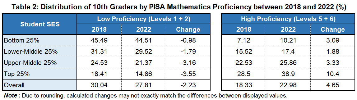 Specifically, Table 2 highlights mathematics results, where the SES-based gap expanded most significantly. Student SES, reflecting family characteristics including parental occupation, educational attainment, and the number of books at home as reported by students, was divided into four groups. The table displays the distribution of students by proficiency level in 2018 and 2022. While the national average achievement remained stable between the two years, the top 25% SES group showed a notable reduction in the proportion of students with low proficiency and a substantial increase in those with high proficiency compared to other SES groups. This trend reflects an expansion of SES-based disparities from 2018 to 2022, primarily driven by achievement improvements among high-SES students, despite the pandemic.