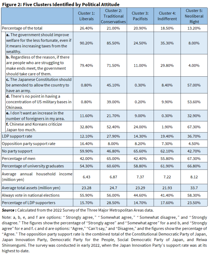 In other words, there are three major political issues in modern Japan. The first is the constitution and security, both of which are key issues in postwar conservative reform. The second is inequality. The third issue is xenophobia. The 2022 Survey of the Three Major Metropolitan Areas included questions about these three issues. While people’s attitudes toward these issues are somewhat interrelated, they are also independent. Using cluster analysis, we categorized people’s political attitudes and identified five highly distinctive clusters. Figure 2 shows the characteristics of each cluster. The cluster analysis used six questions: a through f. Questions a and b evaluated income redistribution policies that reduce disparities. Questions c and d evaluated constitutional reform and the Japan-US security system. Questions e and f evaluated xenophobia and anti-China/anti-Korea sentiment.